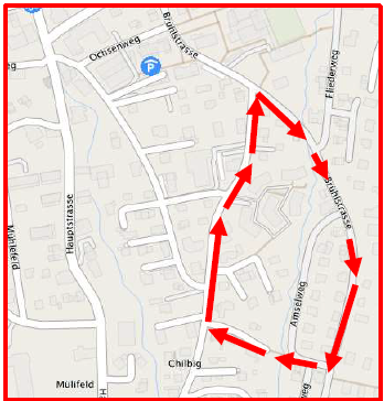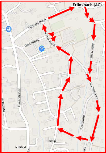 Schulanlage Kretz – Küttigerstrasse – Gehrenstrasse – Fliederweg – Brühlstrasse – über Brücke – Kilbigstrasse – Schulanlage Kretz